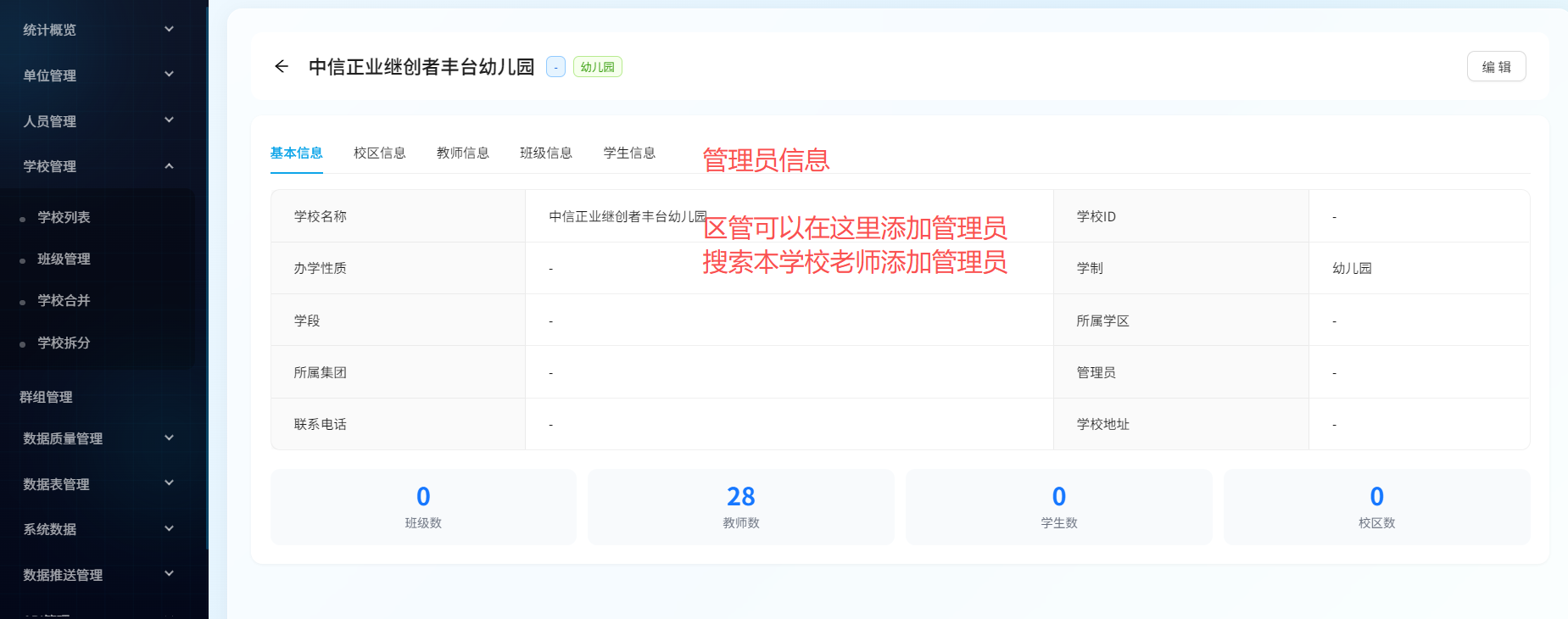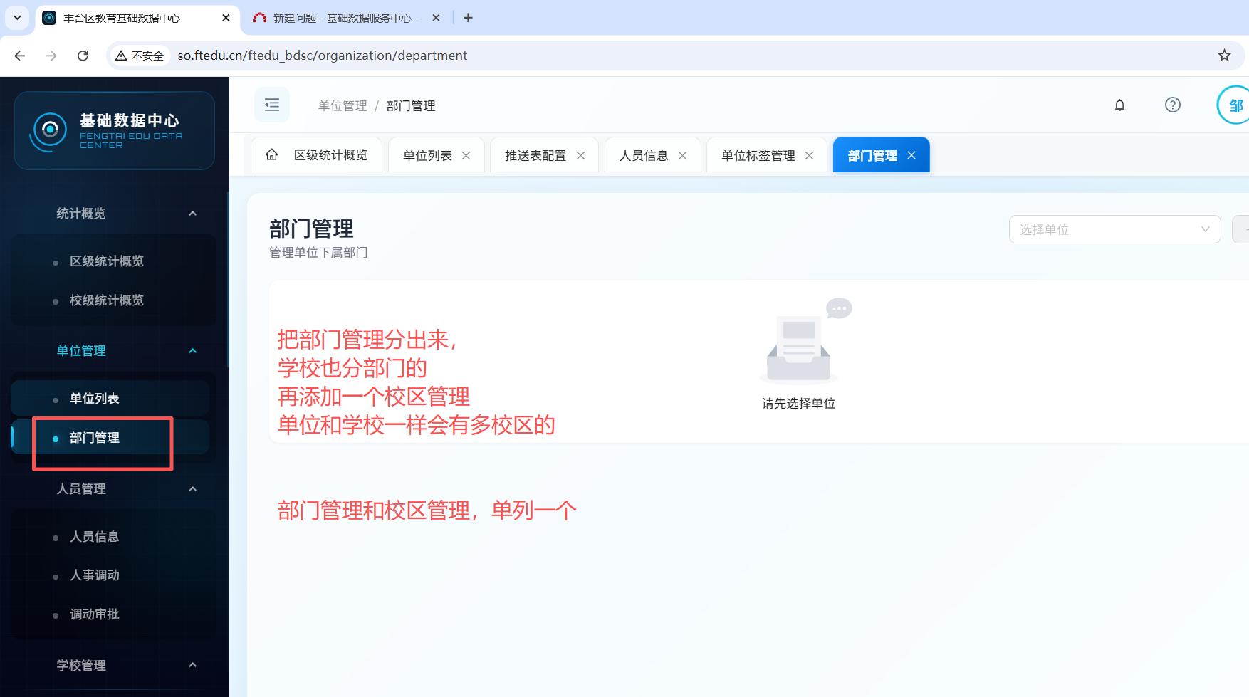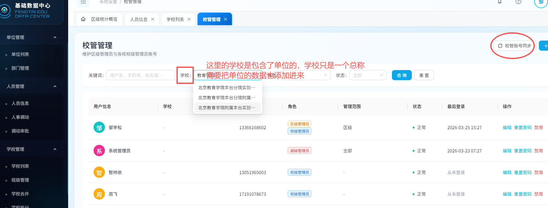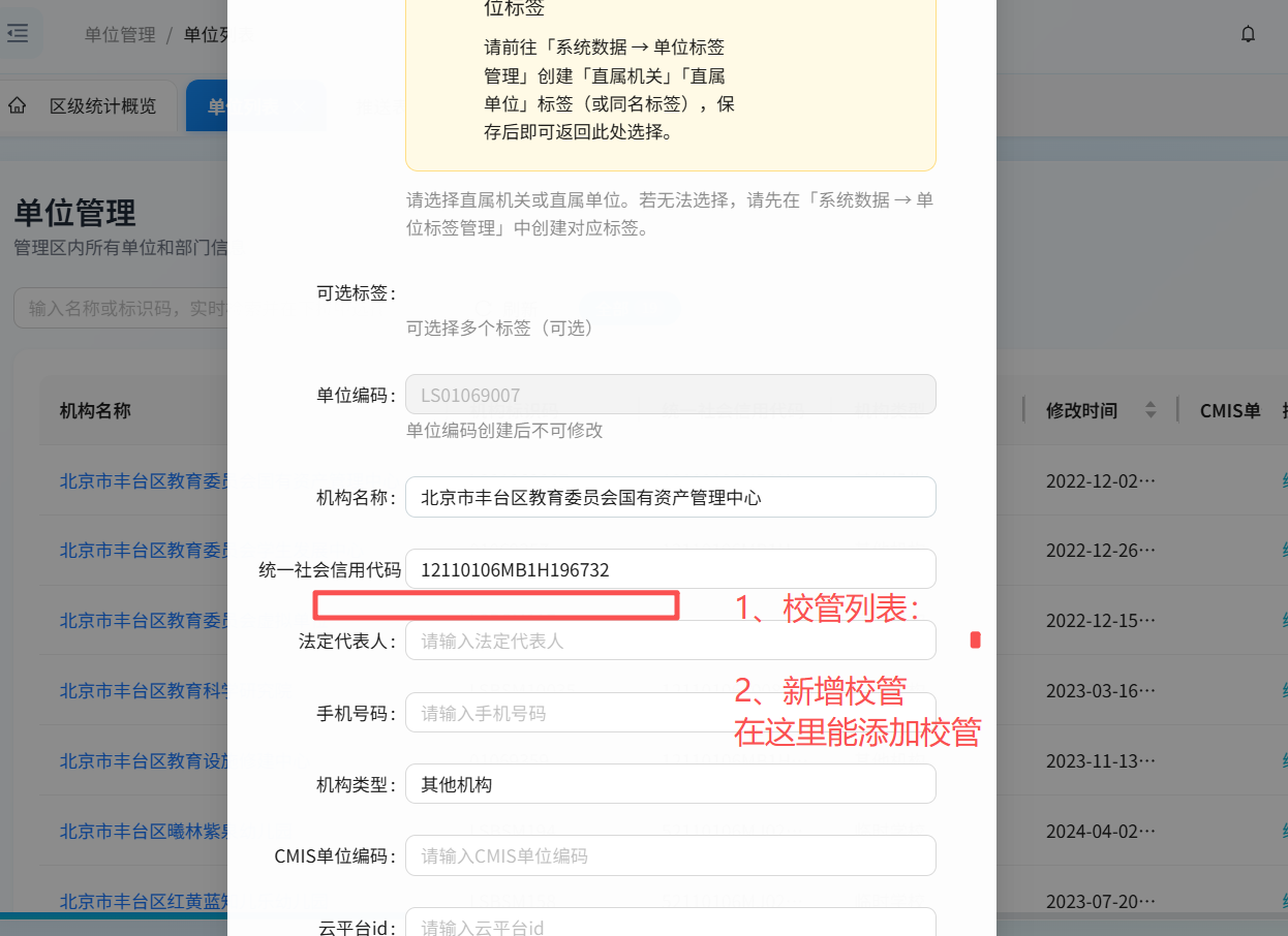 校管管理里的学校需要把单位也添加进来