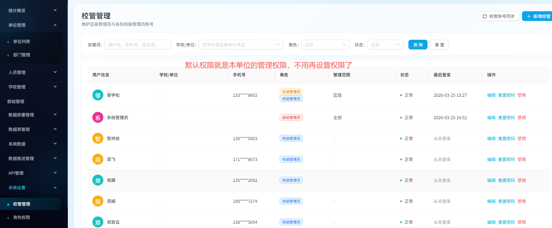 校管同步过来默认权限,不要再设置权限了