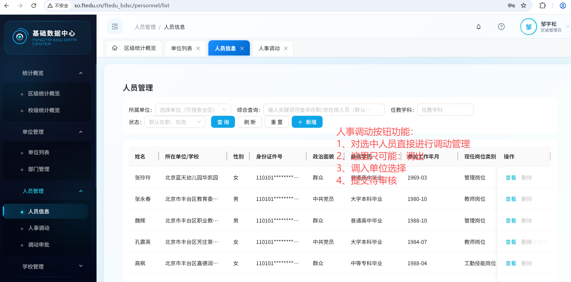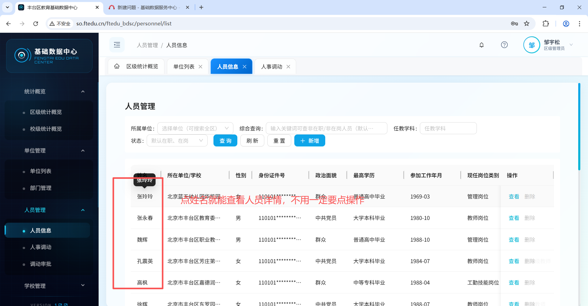 人员管理 ,查看功能点:姓名即可查看详情