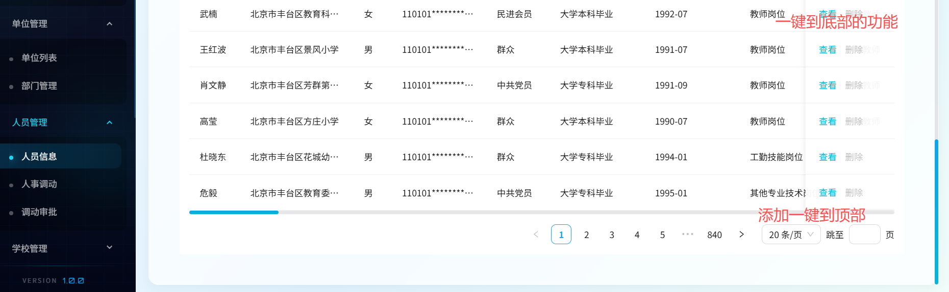 人员管理纵向菜单功能修改:一键到顶部、一键到底部功能
